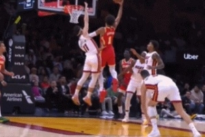 鹰王起飞!杰伦·约翰逊晃倒丰泰基奥单臂隔扣哈克斯GIF-约翰逊晃倒丰泰基奥单臂隔扣哈克斯