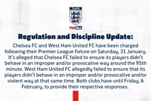 官方:在英超引发冲突,英足总对切尔西和西汉姆联提起指控体育资讯2月5日讯英足总官方宣布,已经就切尔西3-2西汉姆联最后时刻的冲突对两家俱乐部提起指控。英足总发布监管与纪律更新公告:针对1月31日周六英超联赛中的行为,切尔西足球俱乐部与西汉姆联足球俱乐部已遭