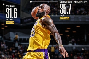 炸裂!老詹今日暴扣垂直起跳80厘米&滑行2.9米 球过筐时速58公里老詹今日对阵篮网暴扣垂直起跳80.3厘米&滑行2.9米球过筐时速57.5公里(16米每秒)GIF-詹姆斯暴扣