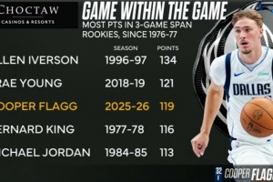 继续爆?弗拉格过去三场119分 76-77赛季新秀以来仅次于AI和吹杨独行侠对阵马刺,转播方给出弗拉格数据:过去三场比赛弗拉格合砍119分,是自76-77赛季新秀连续三场得分之和的第三高,仅次于艾弗森和特雷·杨。