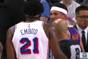 恩比德摊手耸肩抱怨布克犯规!后者呛声后直接离场:全是球尼格!恩比德起身后摊手耸肩抱怨布克犯规布克回头喷恩比德:“我打的全是球,尼格。全是球,尼格。”布克最后防守GIF-恩比德&布克半场最后一回合起争执