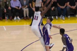 这姿势有点搞笑恩比德诡异姿势造成拉拉维亚投篮犯规GIF-恩比德造犯规