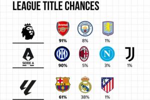 五大联赛夺冠概率:阿森纳91%、国米90%、巴萨61%、拜仁98%体育资讯02月03日讯根据EuroClubIndex的预测数据,五大联赛最新夺冠概率如下。英超:阿森纳-91%曼城-8%阿斯顿维拉-1%意甲:国际米兰-90%AC米兰-5%那不勒斯-3%尤文图斯-1%西