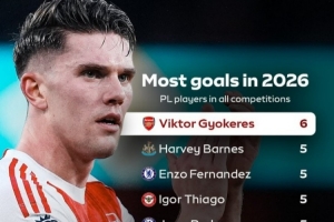 英超球员2026年各项赛事进球榜:约克雷斯6球独占榜首,恩佐等5球体育资讯2月8日讯在本轮英超,阿森纳3-0击败桑德兰,约克雷斯梅开二度。以下为英超球员在2026年各项赛事进球榜,其中约克雷斯居首。1、约克雷斯6球2、巴恩斯、恩佐、伊戈尔·蒂亚戈、若昂·佩德罗、塞梅尼