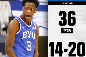 状元热门!迪班萨打满全场20投14中砍下36分7助 带队险胜贝勒大学体育资讯2月11日讯NCAA常规赛,杨百翰大学99-94击败贝勒大学。状元热门AJ·迪班萨出战40分钟,20投14中,三分4中1,罚球8中7爆砍36分7助攻1抢断,仅1次失误。上半场迪班萨就砍下全队41